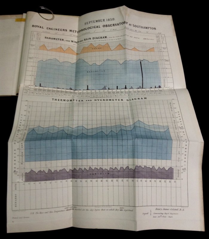 FIRST EDITION, 8vo hardback bound in blue cloth, with gilt lettering to front cover, pp53, followed by 34pp. Tables For the Reduction of the Meteorological Observations Taken at The Stations of the Royal Engineers, black and white frontis engraving, plus plates and tables, some foldout. Publisher's advertisment bookplate to front pastedown. Some light foxing and offsetting, otherwise a Very Good, clean and bright copy.