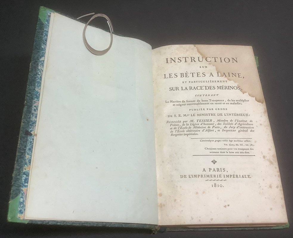 INSTRUCTION SUR LES BETES A LAINE, et particulierement sur la Race des Merinos, contenant La Maniere de former de bons Troupeaux, de les multiplier et soigner convenablement en sante et en maladie, publiee par ordre de S. E. M.gr le Ministre de l'Interieu