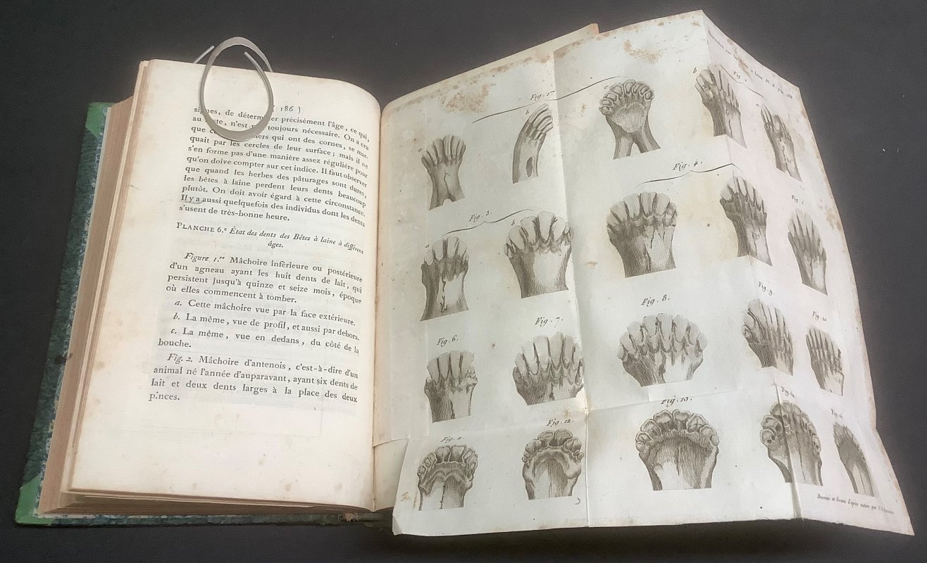8vo., bound in quarter green calf gilt, marbled boards and endpapers, 355pp + errata, six foldout plates. Text in French. Clean copy with no previous ownership inscriptions or annotation. Foxing throughout to varying degrees, dampstained corners to a few pages, boards have a few stains, handling marks and scuffs. A Good, sound copy overall.